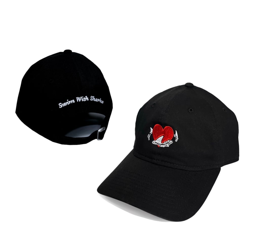 Black Hat with white and red Swim With Sharks Embroidered.